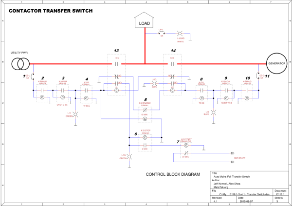 This Auto Mains Fail or Automatic Transfer Switch uses "Relay Logic" to control two motor contactors (rated 100A or above) to transfer power to a load circuit between utility power and a standby generator.